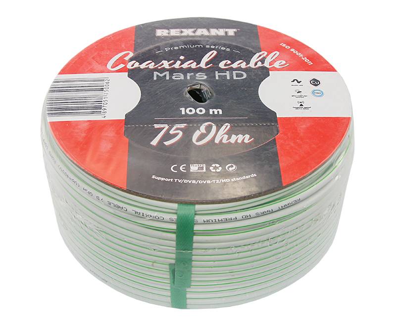 Кабель MARS HD 75 Ohm REXANT. Состоит из центрального медного провода и металлической оплетки (экрана), разделенных между собой слоем диэлектрика (внутренней изоляции) и имеет общую внешнюю оболочку ПВХ (PVC). Кабель служит для передачи высокочастотных сигналов и имеет волновое сопротивление 75 Ом. Коаксиальные кабели, предназначенные для работы в СВЧ диапазоне, называются еще радиочастотными кабелями.