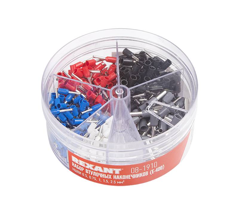 Набор втулочных наконечников НШВИ (0.5 мм²; 0.75 мм²; 1 мм²; 1.5 мм²; 2.5 мм²) в боксе (E-400) REXANT предназначен для создания быстрого и качественного подключения различного электрооборудования и монтажа электросетей. Такой современный способ подготовки кабеля к соединению заменяет процесс облуживания или скрутки многожильных медных проводов, формируя целостное окончание кабеля с последующим подключением промышленного или бытового электрооборудования. Для удобного хранения наконечников предусмотрен специальный бокс, выполненный из прозрачного пластика, что обеспечит визуальный контроль содержимого. Бокс разделен на 5 секций, в каждой из которых находятся наконечники определенного размера. Втулочный наконечник сделан из латуни, с поверхностным электролитическим лужением, и рассчитан на монтаж проводника с соответствующим сечением под опрессовку. Предварительно зачищенные жилы заводятся внутрь латунной втулки и обжимаются специальными пресс-клещами (HT-864 арт.12-3202, 12-3202-4; HT-866 арт.12-3205; HT8 6-4 арт.12-3106; HT-301E арт.12-3113, 12-3114, 12-3013, 12-3013-4) в считанные секунды. Для удобства заведения многожильных проводов внутрь латунной втулки предусмотрена манжета конической формы, изготовленная из поливинилхлорида (ПВХ), обеспечивающая надежную защиту соединения от влаги и других внешних воздействий.