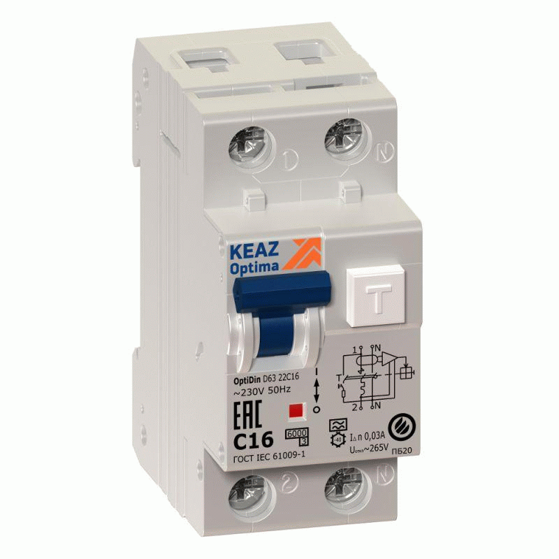 Выключатель автоматический дифференциального тока 2п (1P+N) C 16А 30мА тип A 6кА OptiDin D63-22C16-A-УХЛ4 2мод. КЭАЗ 103507