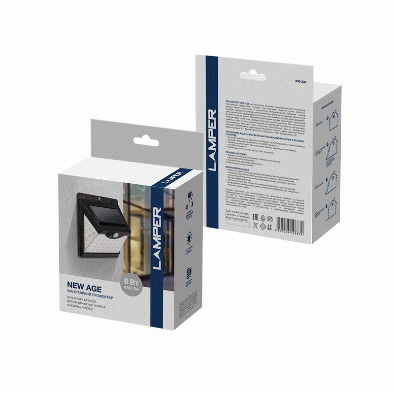 Светильник светодиодный, настенный на солнечной батарее с датчиком движения и освещенности (фотореле), 8 LED LAMPER