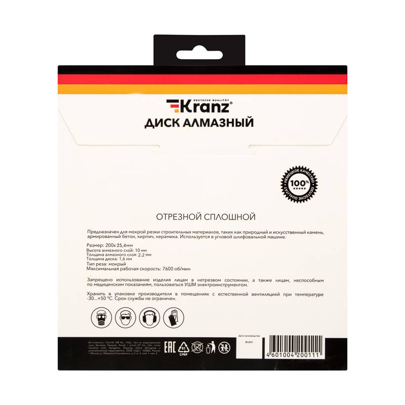 Диск алмазный отрезной сплошной 200x25.4/22.2x2x10 мм KRANZ