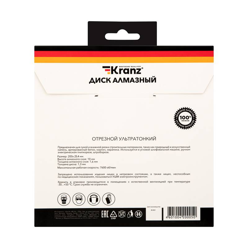 Диск алмазный отрезной ультратонкий 200x25.4/22.2x1.8x10 мм KRANZ