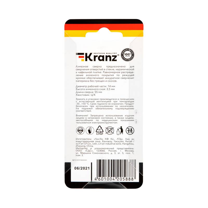Сверло алмазное 14 мм по керамограниту, керамике и стеклу Kranz