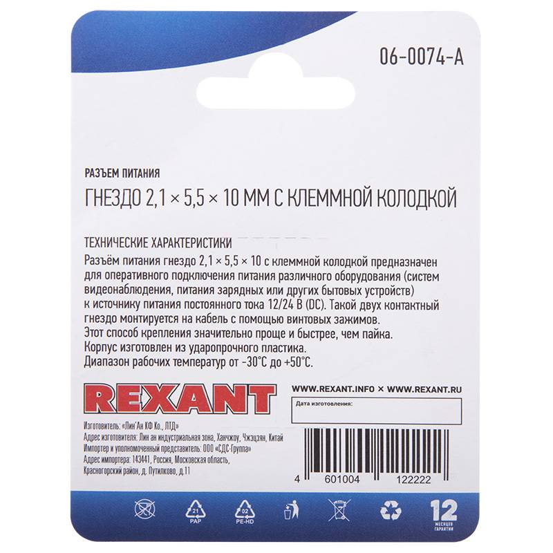 Разъем питание на кабель, гнездо 2,1х5,5x10мм с клеммной колодкой, (1шт), REXANT