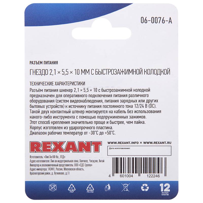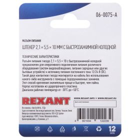 Разъем питание на кабель, штекер 2,1х5,5x10мм с быстрозажимной колодкой, (1шт), REXANT