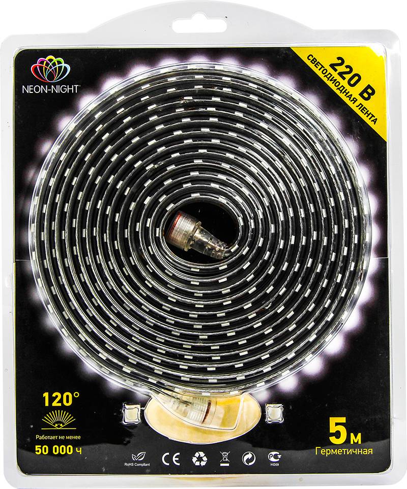 LED Лента 220В, 6x10.6 мм, IP67, SMD 3014, 120 LED/m, цвет свечения белый, 5м (с комплектом подключения)