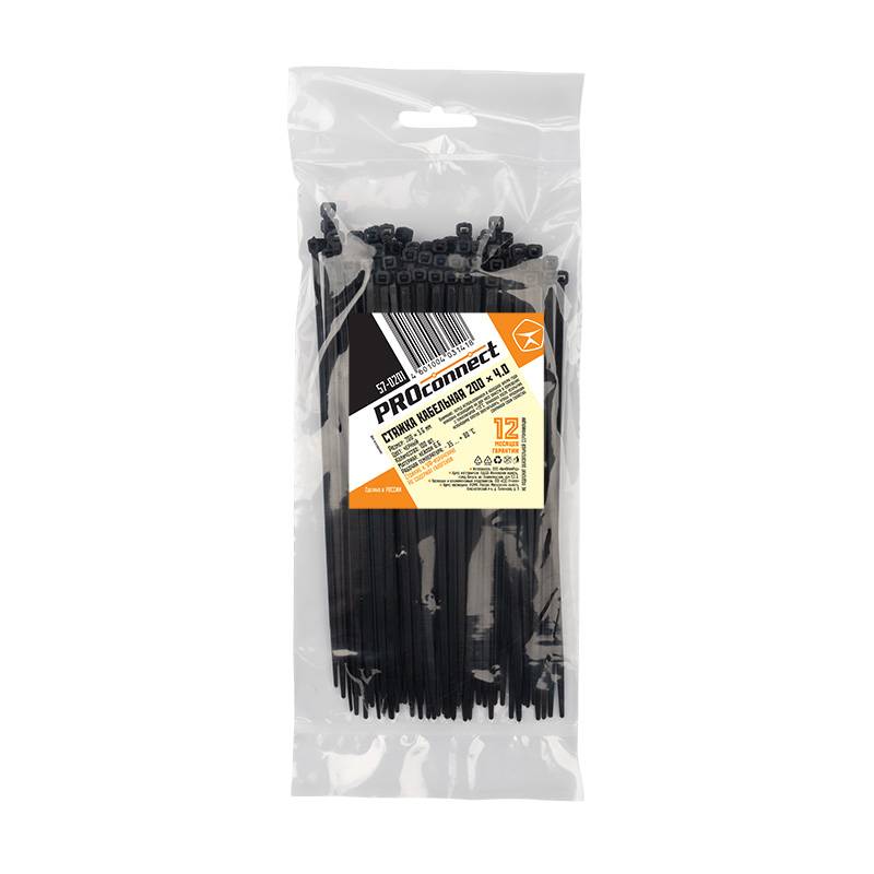 Хомут-стяжка кабельная нейлоновая 200x3,6мм, черная (100 шт/уп) PROconnect