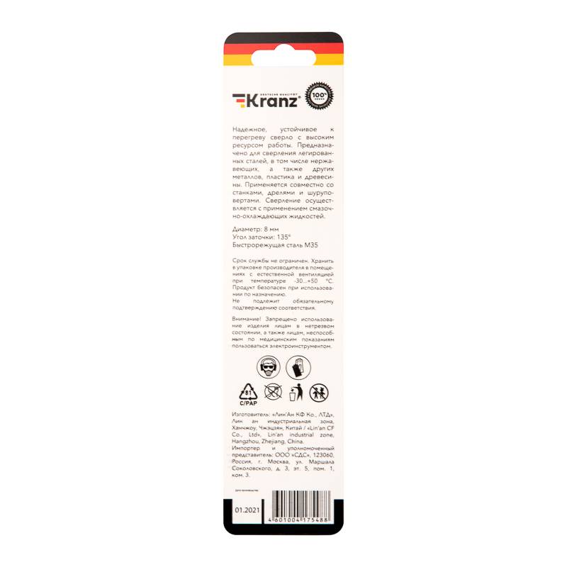 Сверло по металлу 8х117х75 мм «Кобальт» (сталь HSS-Co 5% M35 P6M5K5) (1 шт. в блистере) DIN 338 Kranz