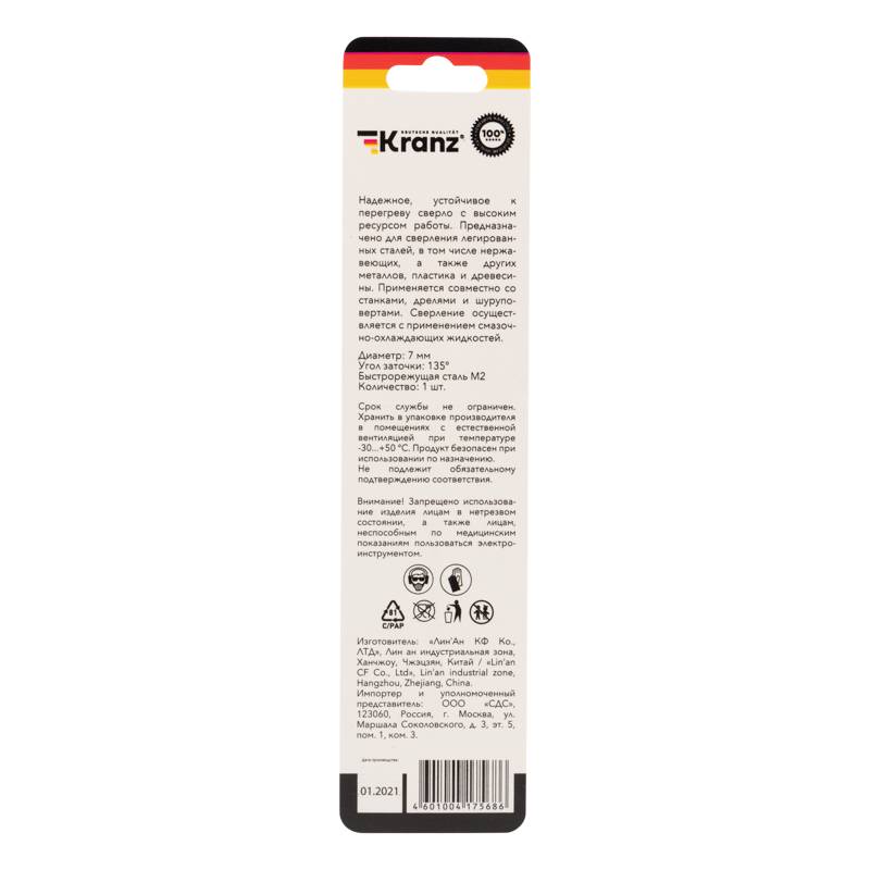Сверло по металлу 7х109х96 мм «Стандарт+» (P6M5 M-2) (1 шт. в блистере) DIN 338 Kranz