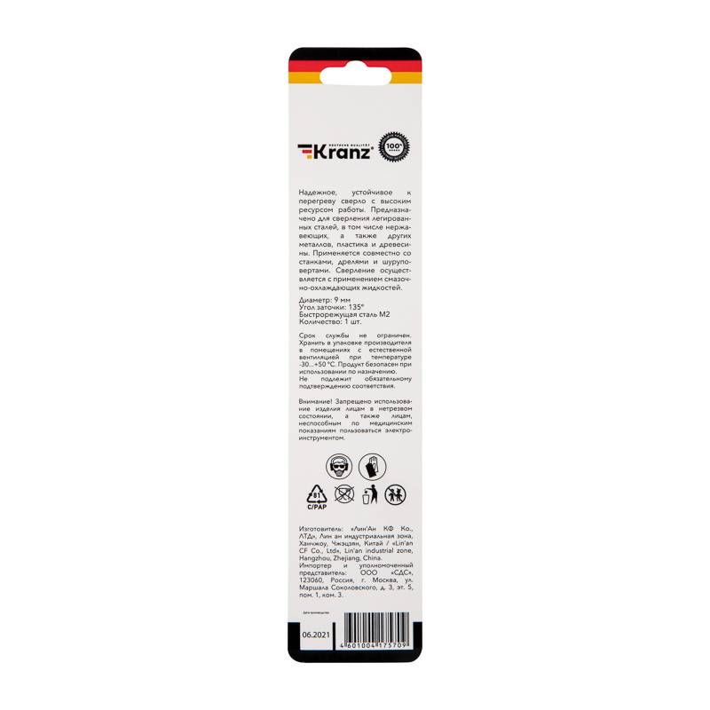 Сверло по металлу 9х125х81 мм «Стандарт+» (P6M5 M-2) (1 шт. в блистере) DIN 338 Kranz