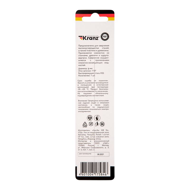 Сверло по металлу 8,0х117х75 мм HSS (1 шт. в упаковке) DIN 338 Kranz
