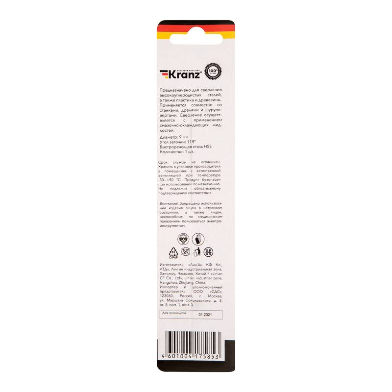 Сверло по металлу 9,0х125х81 мм HSS (1 шт. в упаковке) DIN 338 Kranz
