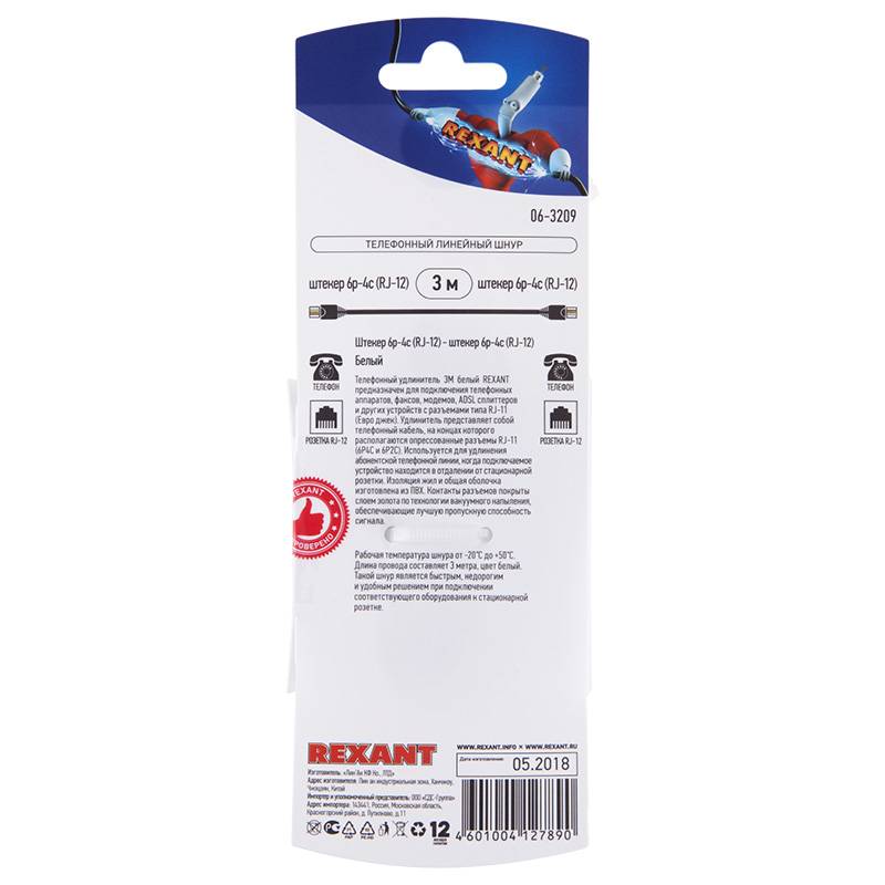 Удлинитель телефонный 6р-4с, 3 м, белый REXANT
