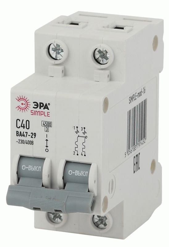 SIMPLE-mod-14 ЭРА SIMPLE Автоматический выключатель 2P 25А (C) 4,5кА ВА 47-29 (6/90/2520)
