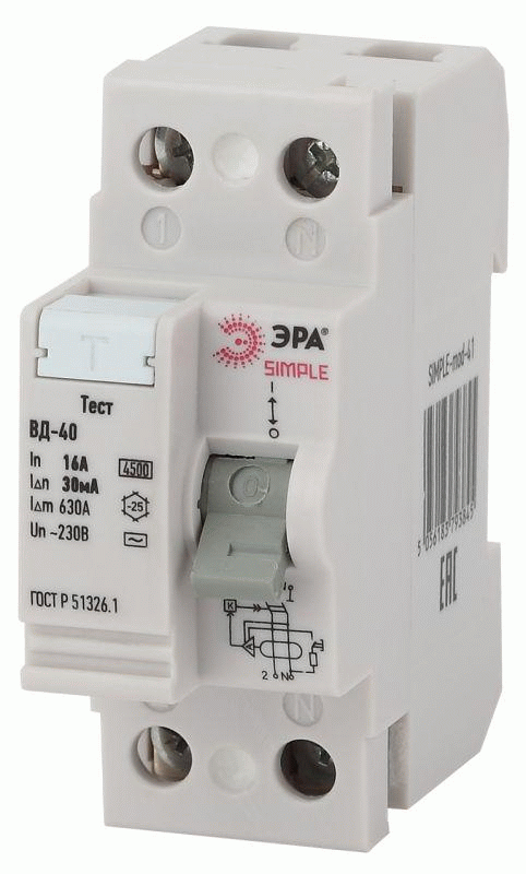 SIMPLE-mod-41 ЭРА SIMPLE Устройство защитного отключения УЗО ВД-40 2P 16А/30мА (электронное) (100/24