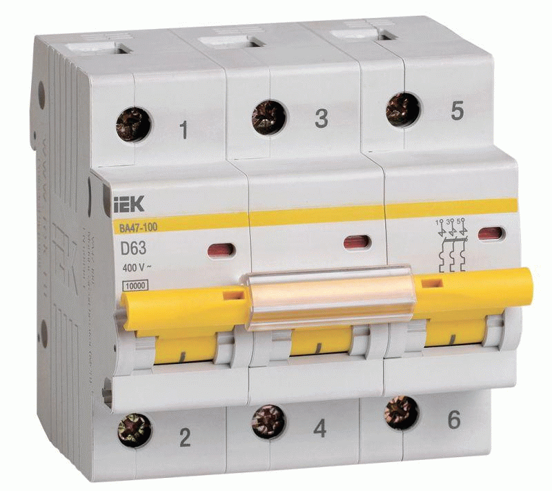 Выключатель автоматический модульный 3п D 63А 10кА ВА47-100 IEK MVA40-3-063-D