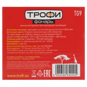 Фонарь налобный светодиодный Трофи TG9 аккумуляторный мощный яркий 2 режима черный