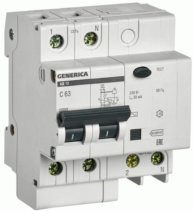 Выключатель автоматический дифференциального тока 2п 63А 30мА АД12 GENERICA IEK MAD15-2-063-C-030