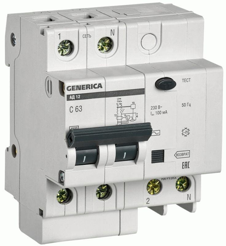 Выключатель автоматический дифференциального тока 2п 63А 100мА АД12 GENERICA IEK MAD15-2-063-C-100