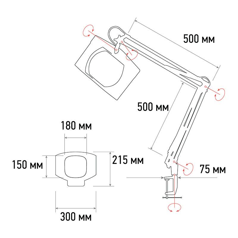 Лупа на струбцине REXANT, квадратная, 5D, с подсветкой 60 SMD LED, сенсорный регулятор яркости, белая