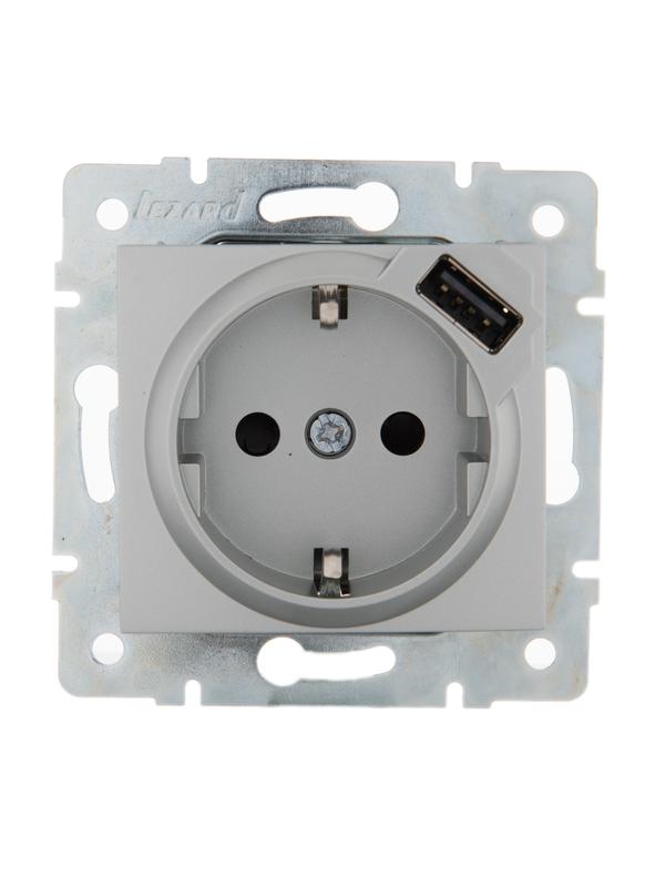 Розетка 1-м СП Karina 16А с заземл. с заряд. устройством USB механизм матов. серебр. LEZARD 707-4388-181