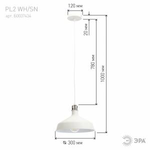 Светильник подвесной (подвес) ЭРА PL2 WH/SN металл, E27, max 60W, высота плафона 200мм, подвеса 780мм,белый/сатин никель
