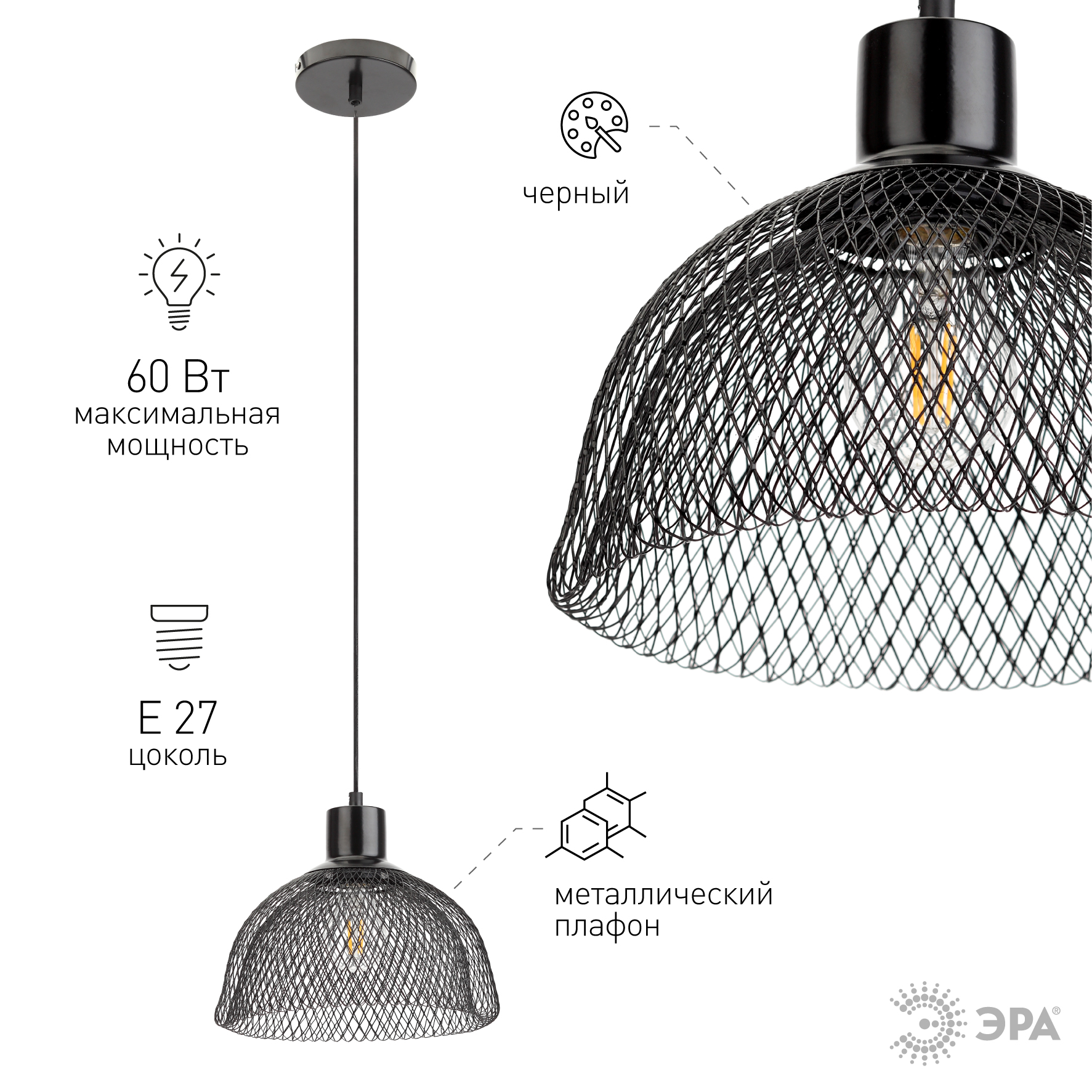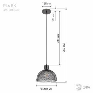 Светильник подвесной (подвес) ЭРА PL6 BK металл, E27, max 60W, высота плафона 200мм, подвеса 730мм, черный
