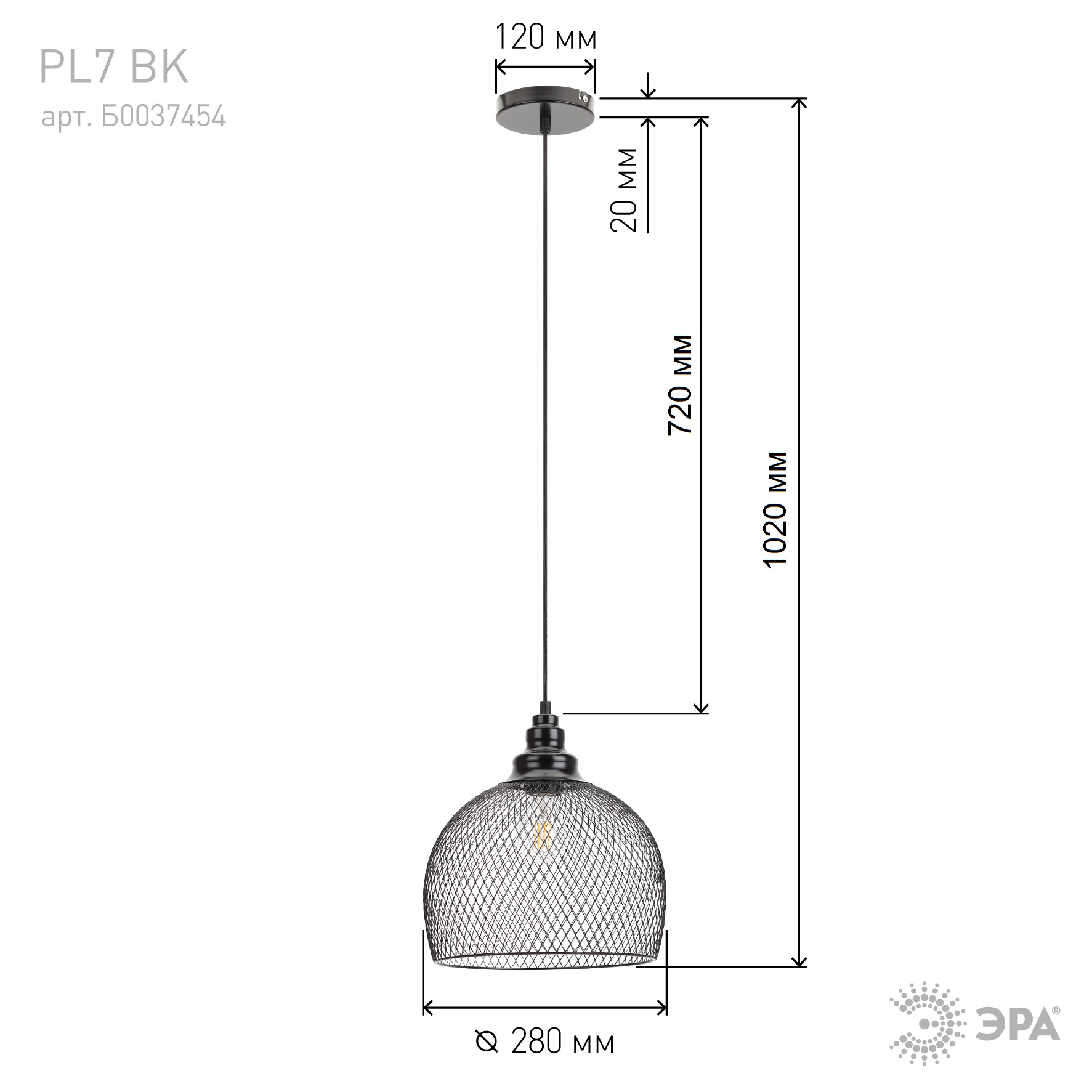 Светильник подвесной (подвес) ЭРА PL7 BK металл, E27, max 60W, высота плафона 280мм, подвеса 720мм, черный