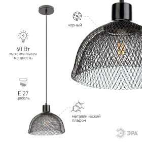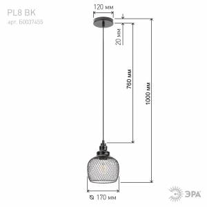 Светильник подвесной (подвес) ЭРА PL8 BK металл, E27, max 60W, высота плафона 220мм, подвеса 760мм, черный