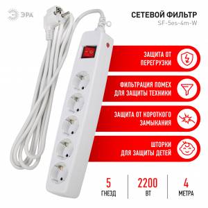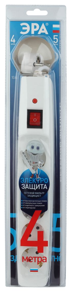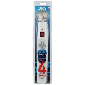 Сетевой фильтр ЭРА SF-5es-4m-W с надежной защитой с заземлением с выключателем 5 розеток 4м 10А белый