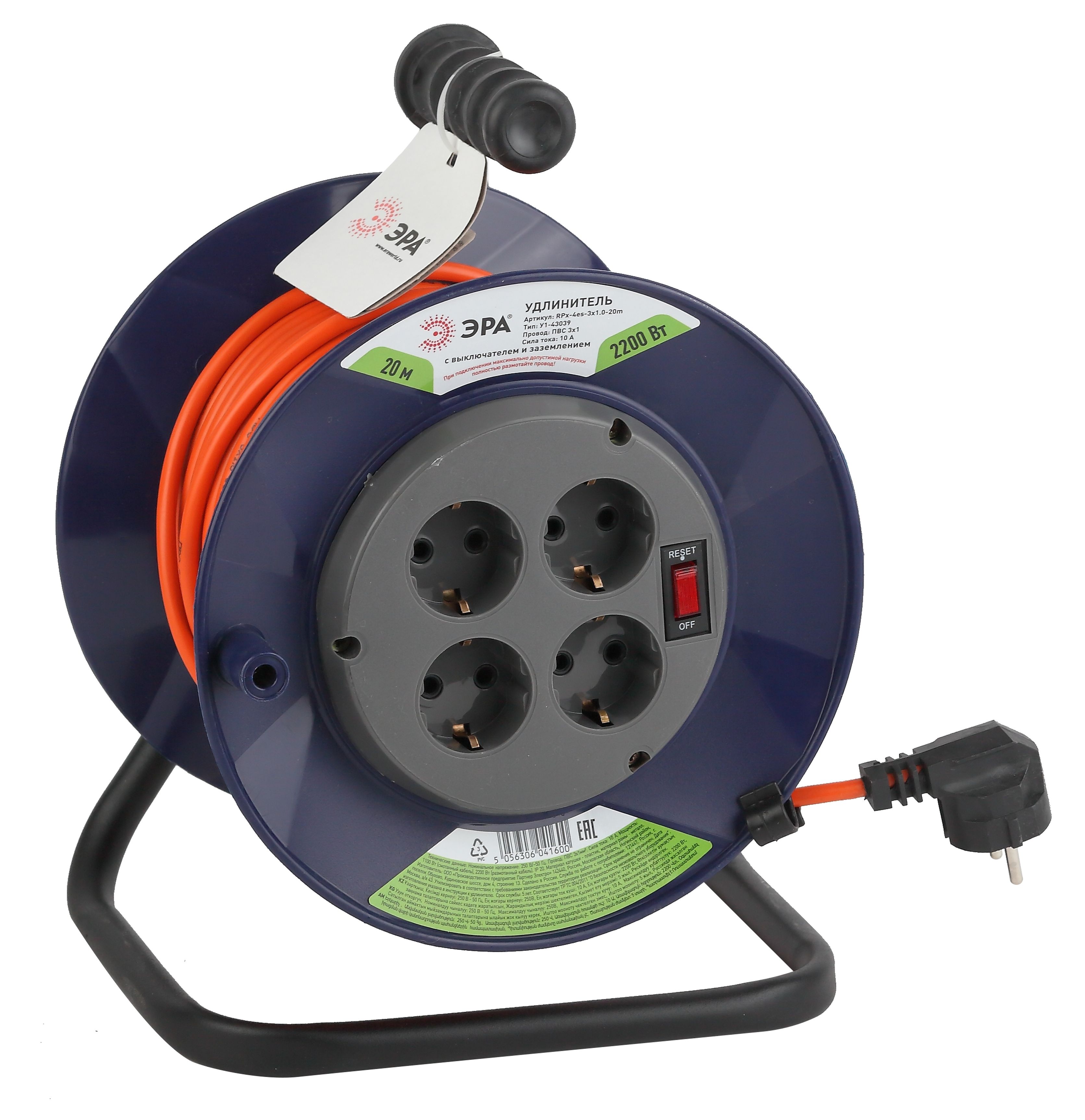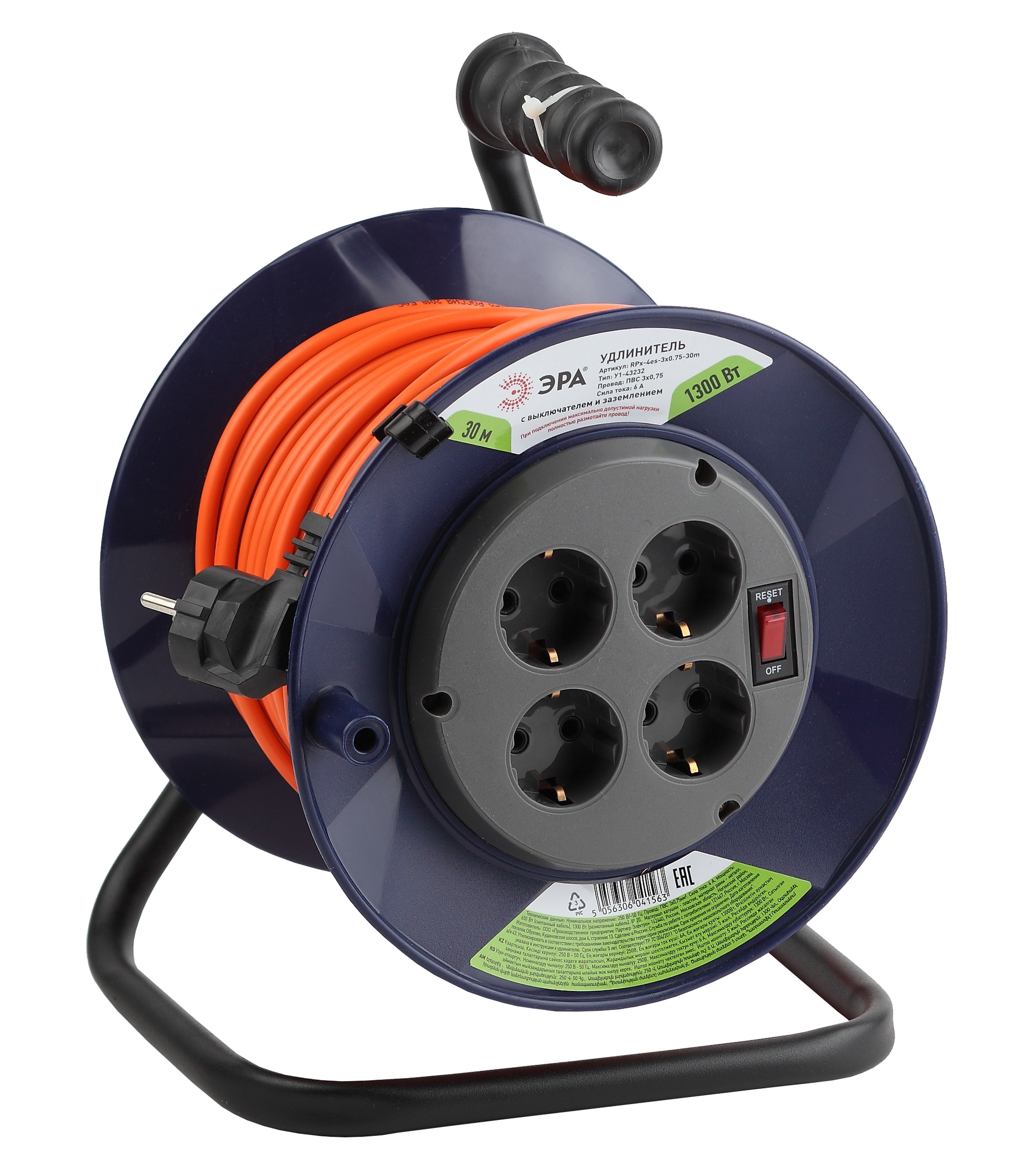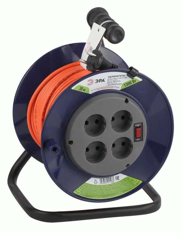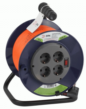Удлинитель силовой ЭРА RPx-4es-3х0.75-30m на пластиковой катушке c заземлением 4 розетки 30м ПВС 3х0.75мм2