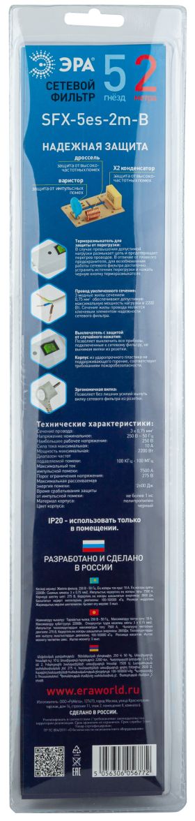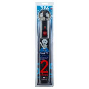 Сетевой фильтр ЭРА SFX-5es-2m-B с надежной защитой с заземлением с выключателем 5 розеток 2м 10А черный