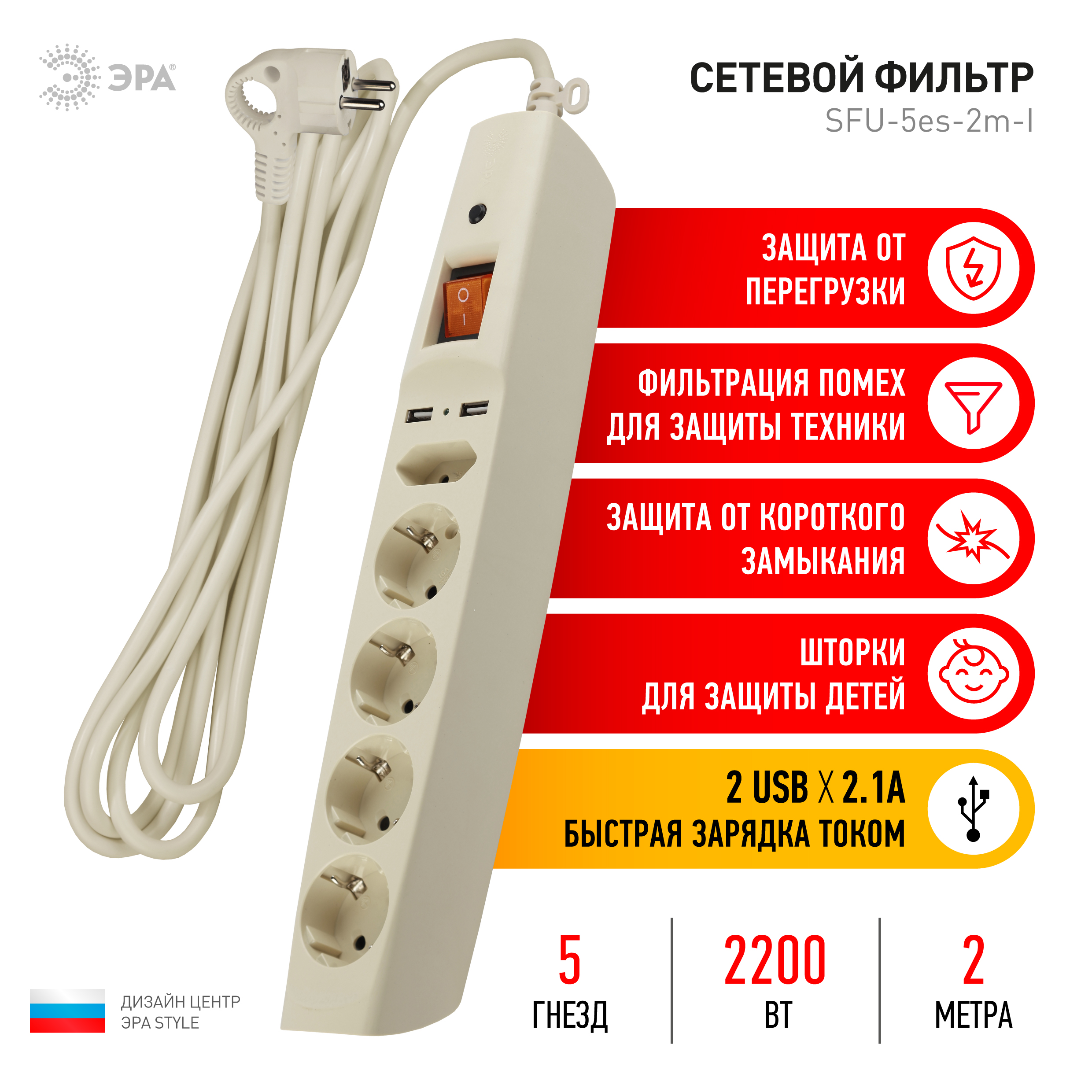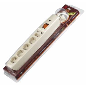 Сетевой фильтр ЭРА SFU-5es-2m-I с надежной защитой с заземлением с выключателем 5 розеток 2xUSB 2м 10А слоновая кость