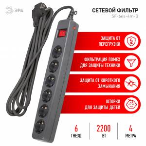 Сетевой фильтр ЭРА SF-6es-4m-B с надежной защитой с заземлением с выключателем 6 розеток 4м 10А черный