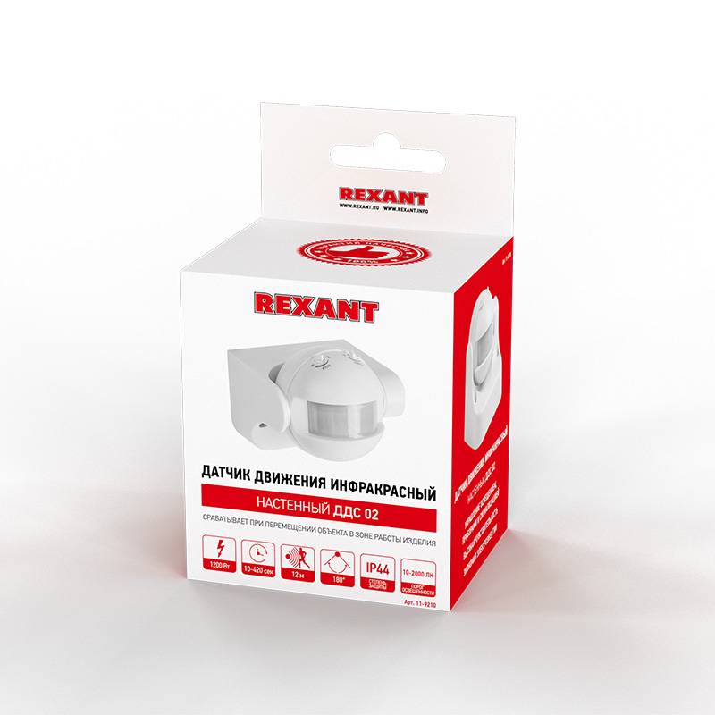 Датчик движения настенный ДДС 02, 180°, 1200 Вт, 10-2000 Лк, 12 м, 10-420 сек. IP44 REXANT