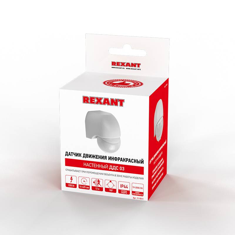 Датчик движения настенный ДДС 03, 180°, 1200 Вт, 10-2000 Лк, 12 м, 10-900 сек. IP44 REXANT