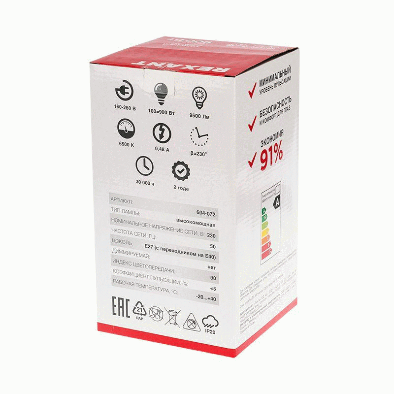 Лампа светодиодная высокомощная 100 Вт E27 с переходником на E40 9500 Лм 4000 K нейтральный свет REXANT