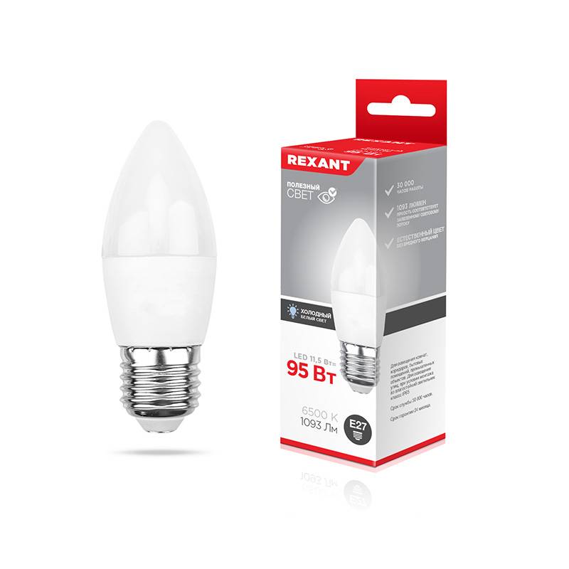 Лампа светодиодная REXANT Свеча CN 9.5 Вт E27 903 Лм 6500 K холодный свет (3 шт./уп.)