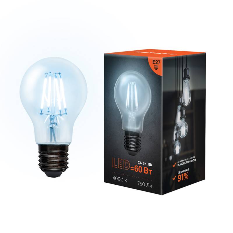 Лампа филаментная REXANT Груша A60 7.5 Вт 750 Лм 4000K E27 прозрачная колба
