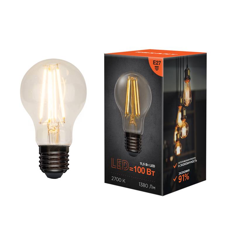 Лампа филаментная REXANT Груша A60 11.5 Вт 1380 Лм 2700K E27 прозрачная колба