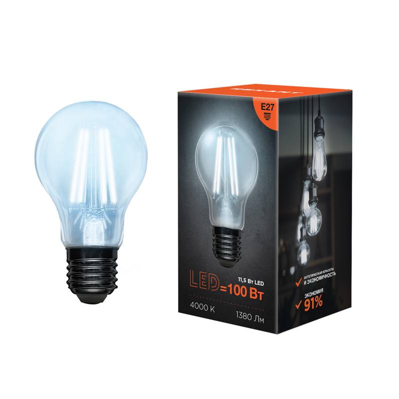 Лампа филаментная REXANT Груша A60 11.5 Вт 1380 Лм 4000K E27 прозрачная колба