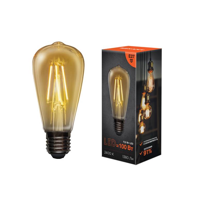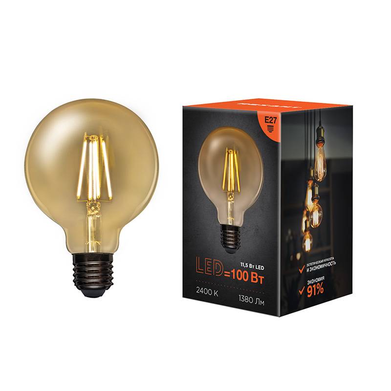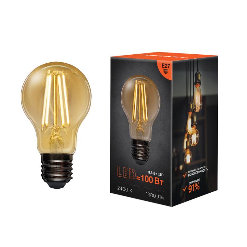 Лампа филаментная REXANT Груша A60 11.5 Вт 1380 Лм 2400K E27 золотистая колба