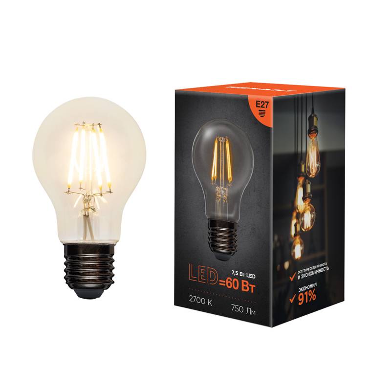 Филаментная лампочка REXANT А60 7.5 Вт 750 Лм 2700 K E27 прозрачная