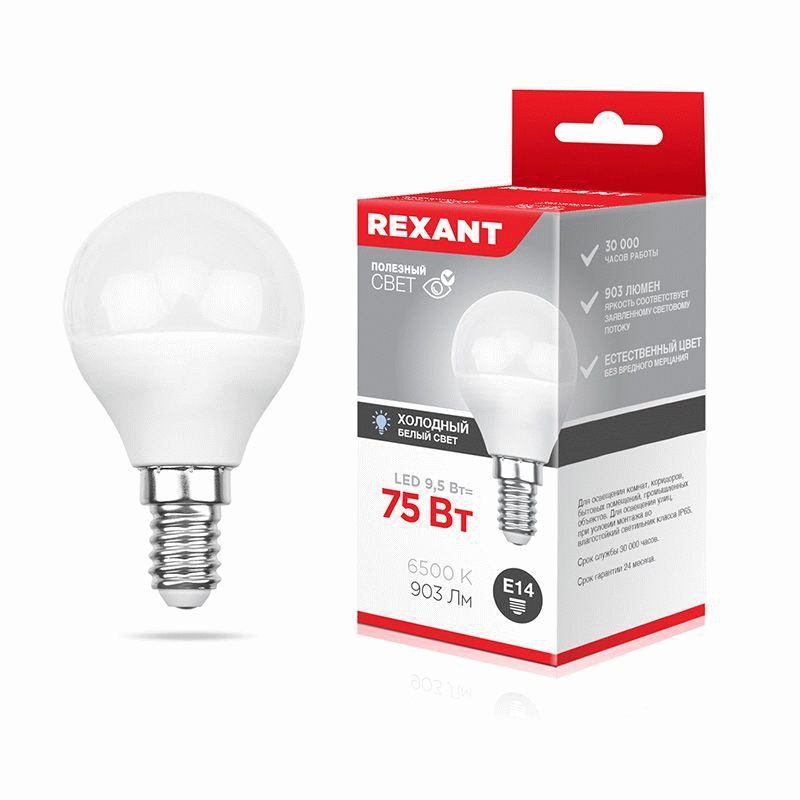 Лампа светодиодная REXANT Шарик (GL) 9.5 Вт E14 903 Лм 6500 K холодный свет (3 шт./уп.)