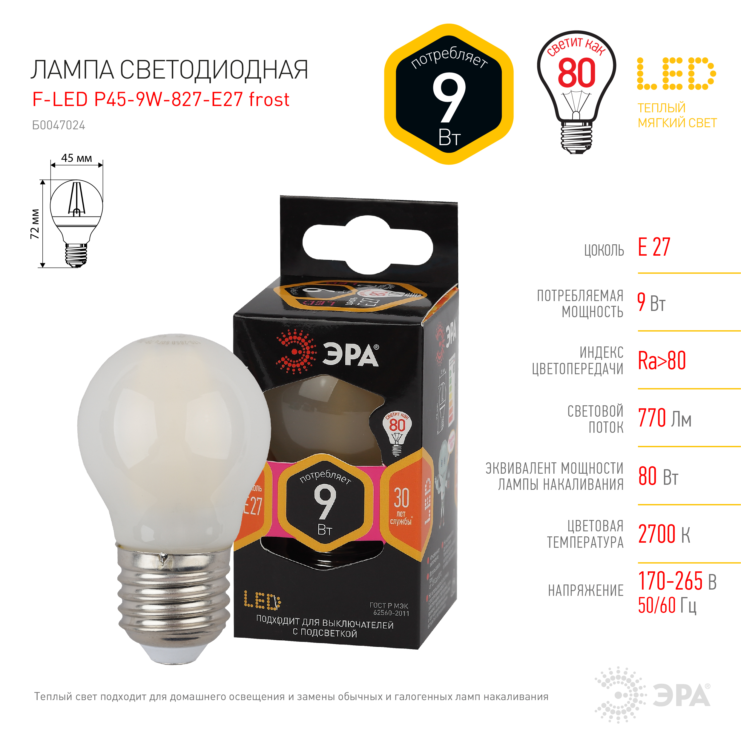 Лампочка светодиодная ЭРА F-LED P45-9w-827-E27 frost E27 / Е27 9Вт филамент шар матовый теплый белый свет