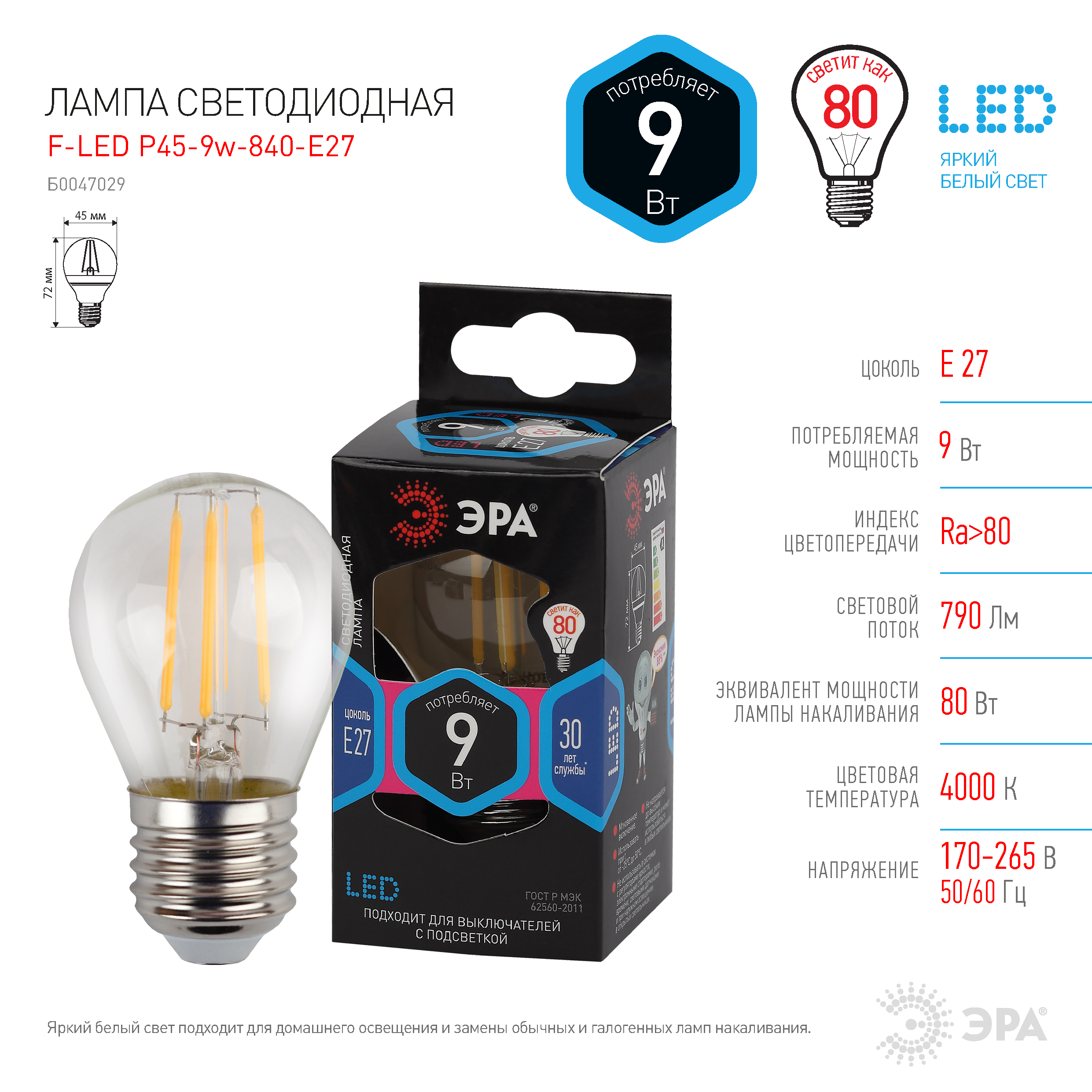 Лампочка светодиодная ЭРА F-LED P45-9W-840-E27 E27 / Е27 9Вт филамент шар нейтральный белый свет