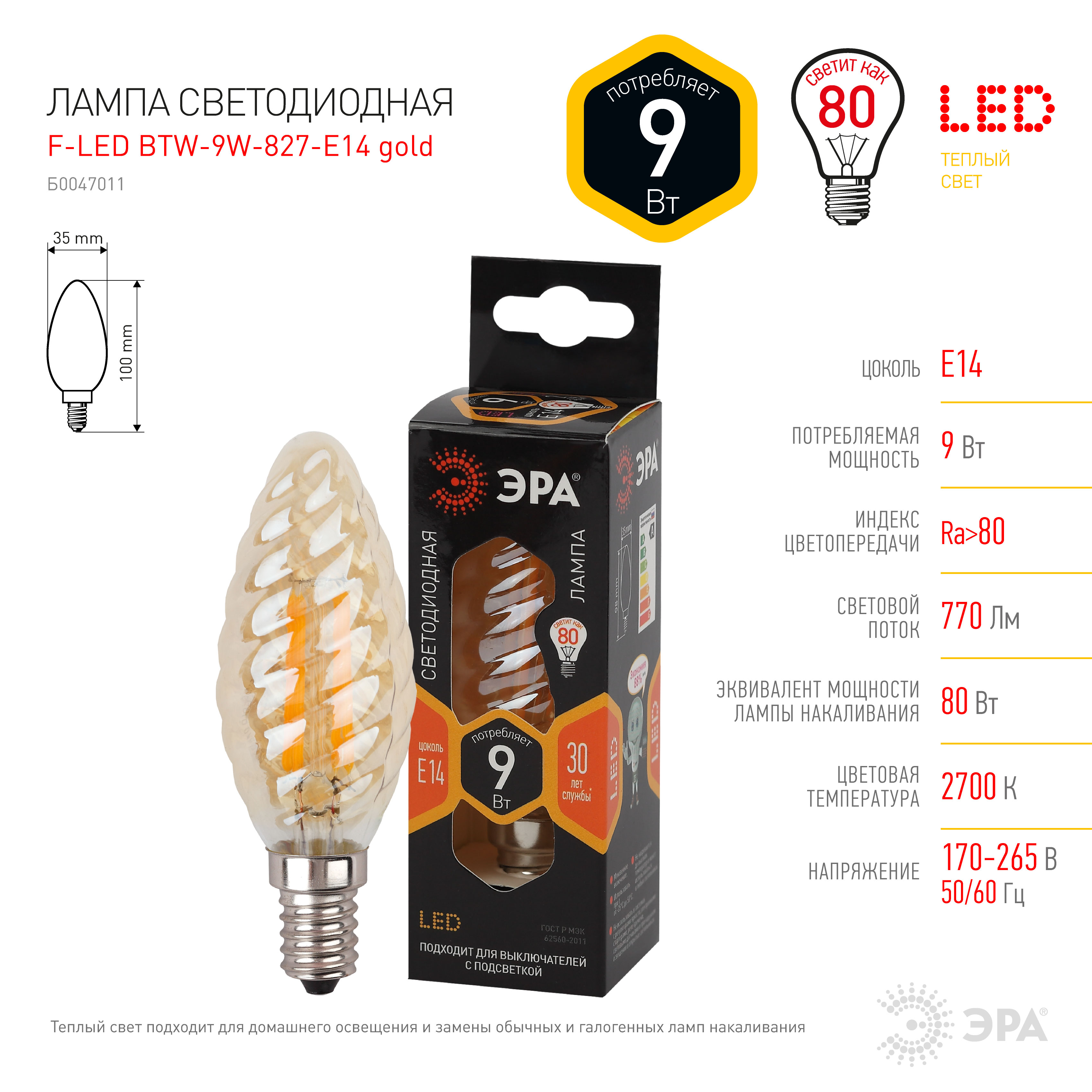 Лампочка светодиодная ЭРА F-LED BTW-9W-827-E14 gold Е14 / Е14 9Вт филамент свеча витая золотистая теплый белый свет