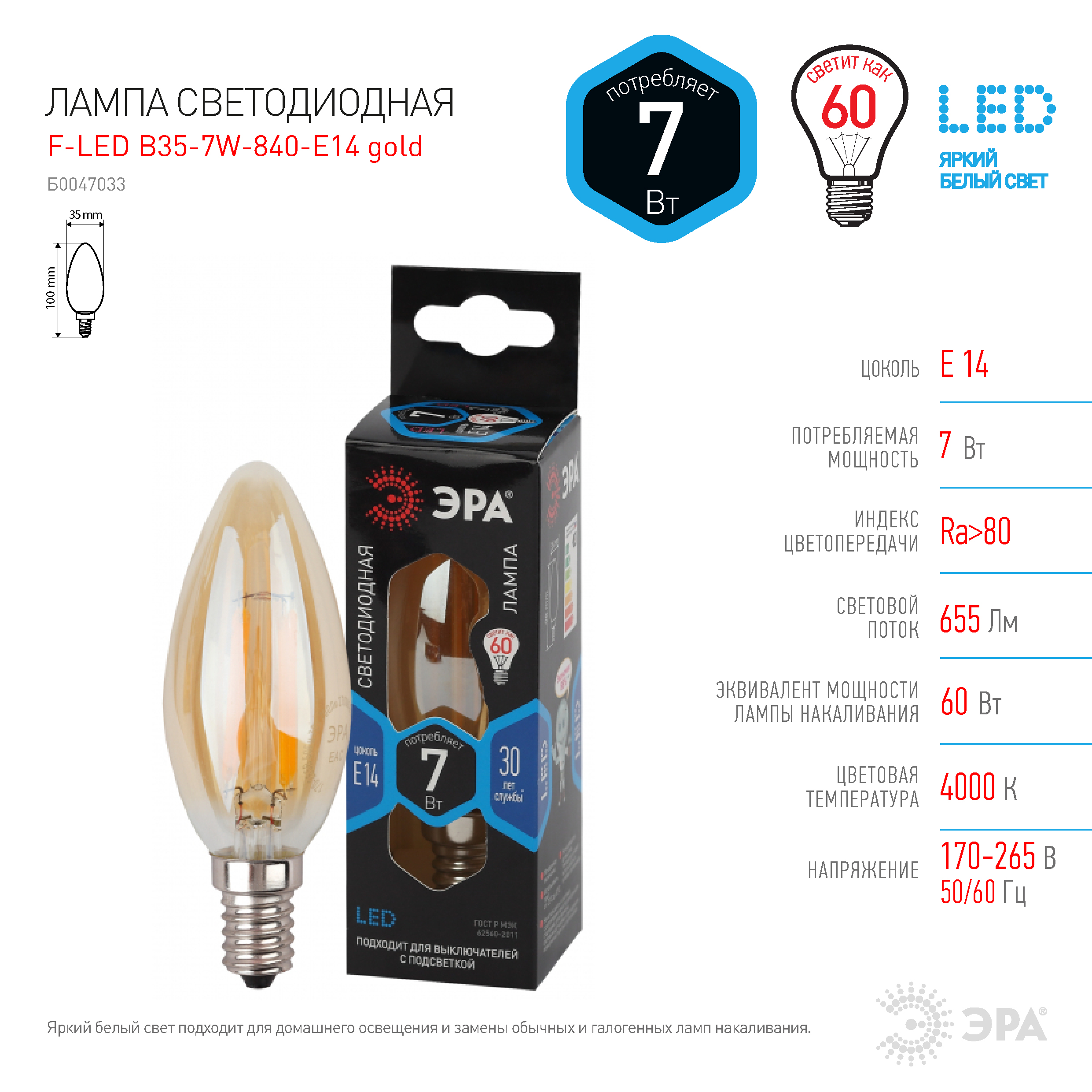Лампочка светодиодная ЭРА F-LED B35-7W-840-E14 gold Е14 / Е14 7Вт филамент свеча золотистая нейтральный белый свет