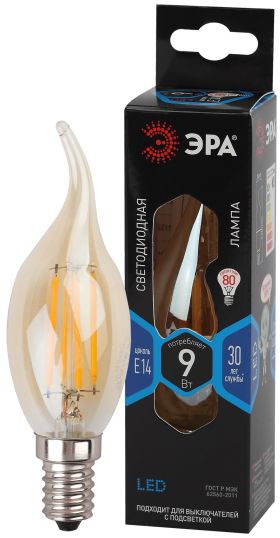 Лампочка светодиодная ЭРА F-LED BXS-9W-840-E14 gold Е14 / Е14 9Вт филамент свеча на ветру золотая нейтральный белый свет