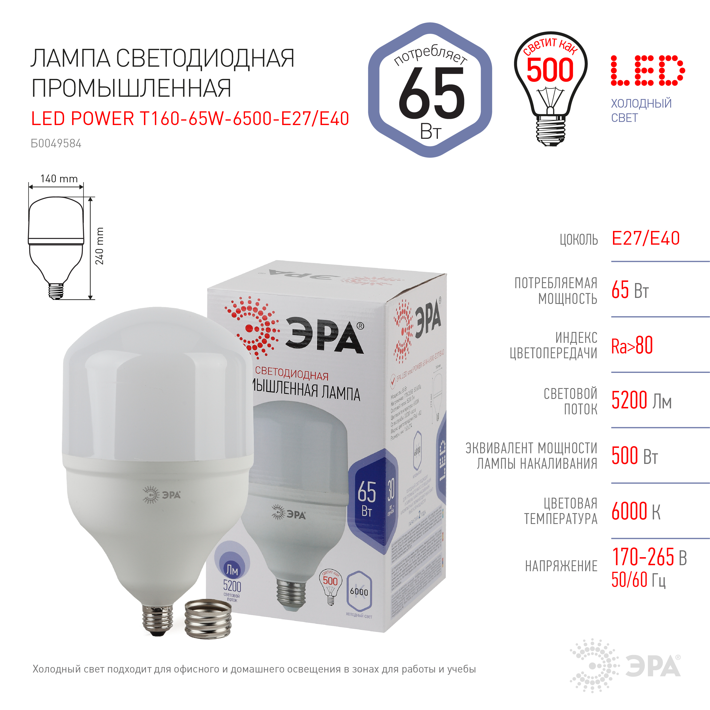 Лампа светодиодная ЭРА STD LED POWER T160-65W-6500-E27/40 Е27 / Е40 65 Вт колокол холодный дневной свет